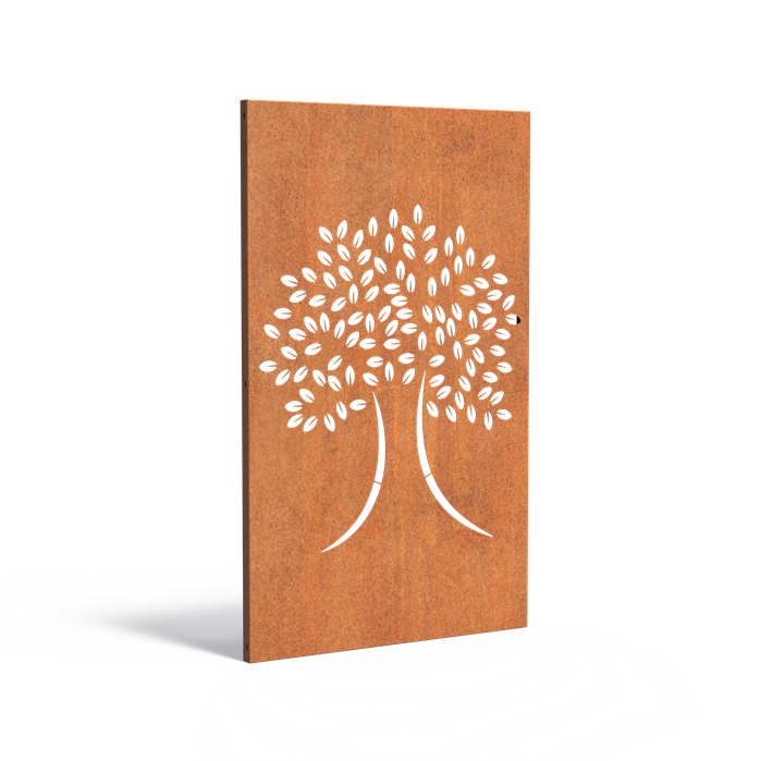 Een cortenstalen paneel met een lasergesneden uitsparing. Decoratief en ideaal voor het creëren van open ruimtes of privacyschermen in open omgevingen. Ook verkrijgbaar met verschillende uitsparingen, afhankelijk van het gewenste patroon.