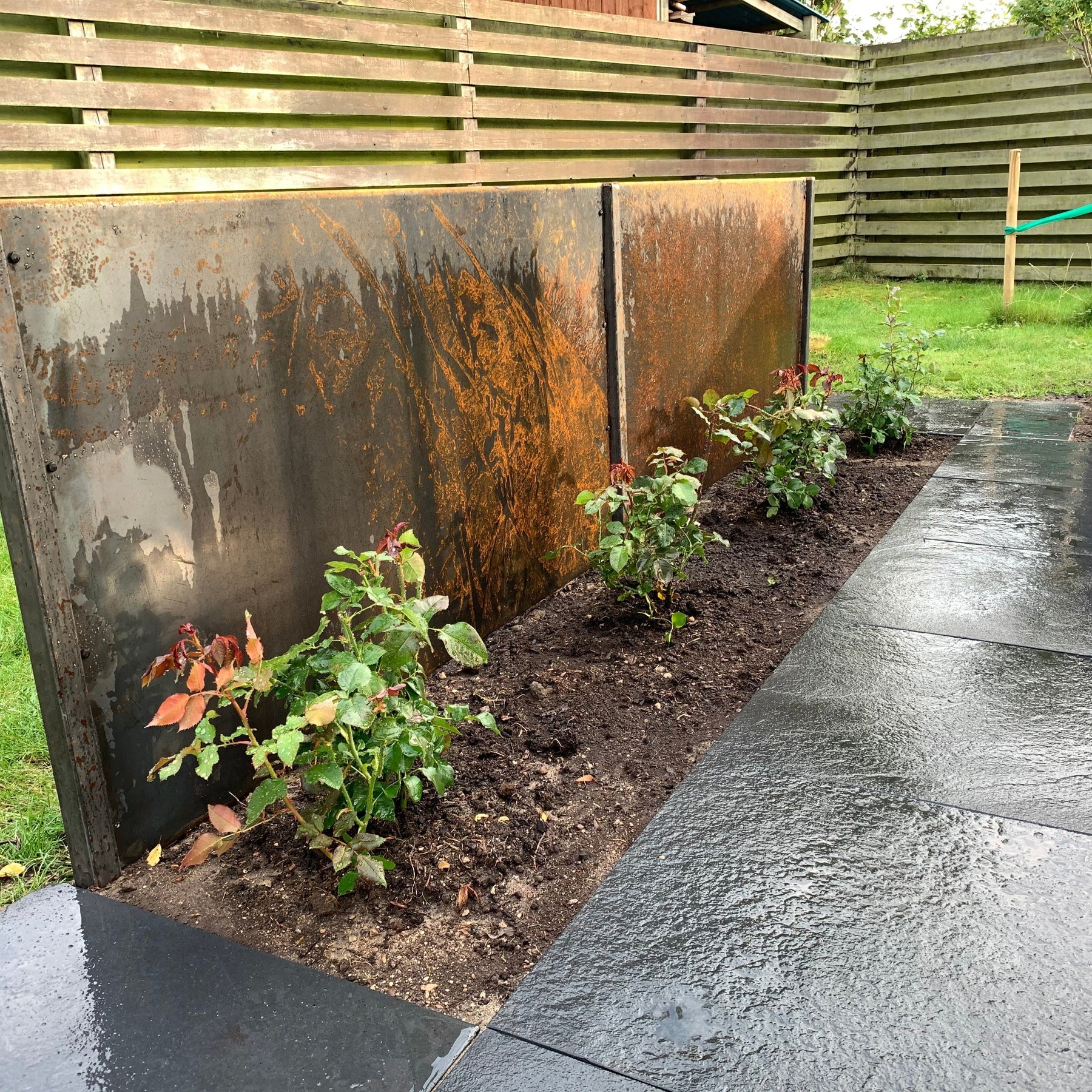 Deze schutting bestaat uit cortenstalen panelen van 3 mm, met een omgezette rand aan de boven- en onderzijde. De panelen worden gemonteerd op gestolen stalen palen van 40 x 40 mm (niet van cortenstaal), waaraan elk paneel wordt vastgeschroefd. De palen zijn 60 cm langer zodat ze stevig in de grond kunnen worden geplaatst.