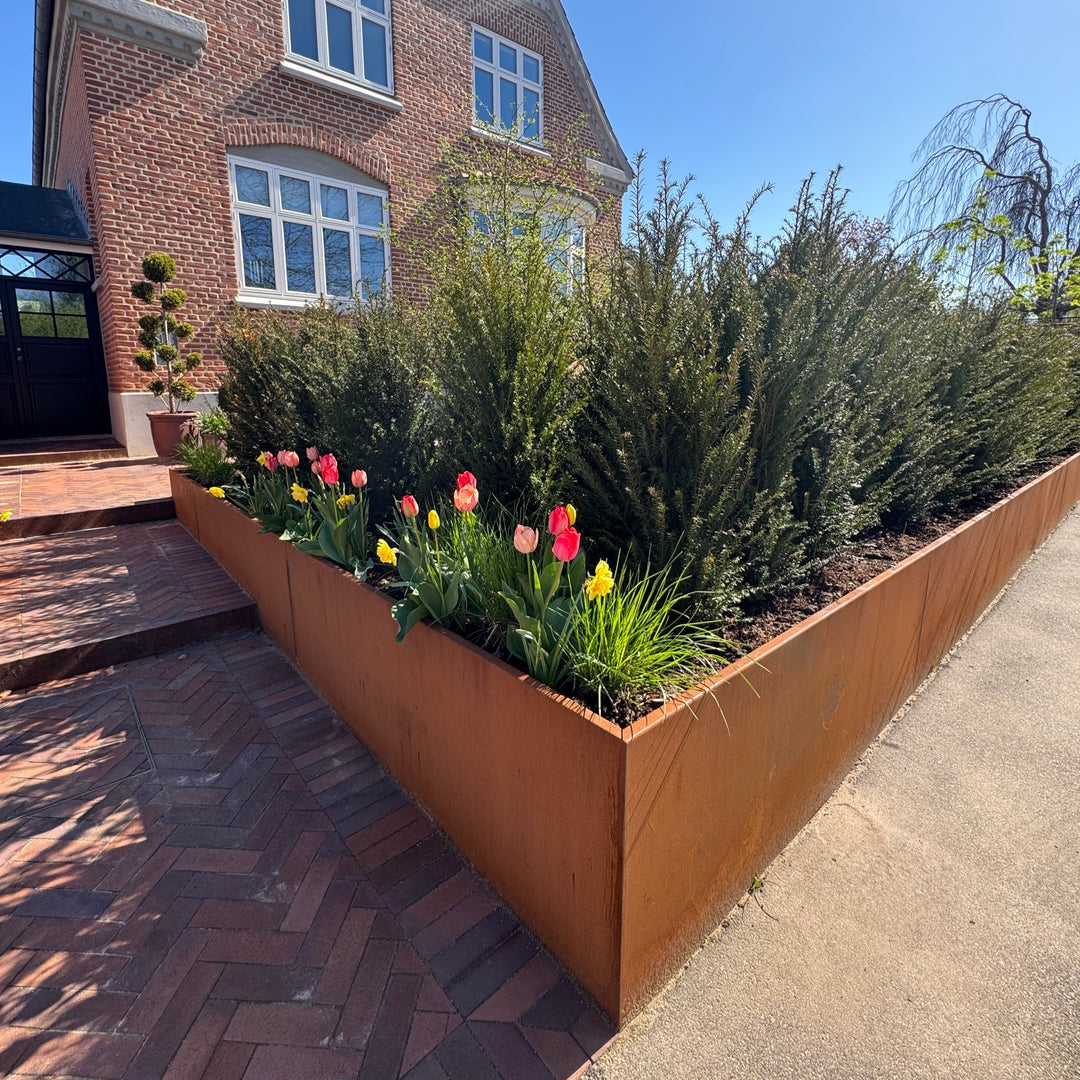 Velen kiezen voor cortenstaal vanwege de natuurlijke roestpatina, die een warme, natuurlijke maar ook moderne uitstraling geeft die past bij alle huizen, bedrijven en gebouwen. De karakteristieke patinalaag beschermt uw nieuwe keerwand tegen corrosie en doorroesten. Dat betekent dat u vele jaren plezier zult hebben van uw cortenstaal keerwand en dat u, in tegenstelling tot keerwanden van alternatieve materialen, niet veel middelen nodig hebt voor het onderhoud ervan.
