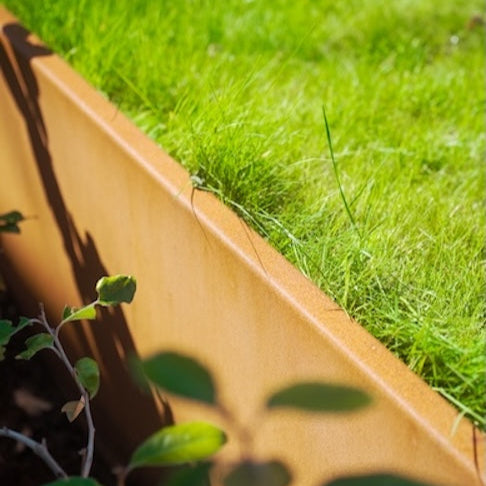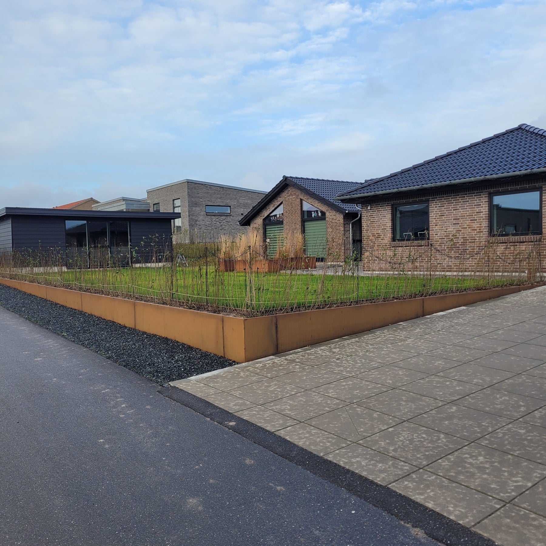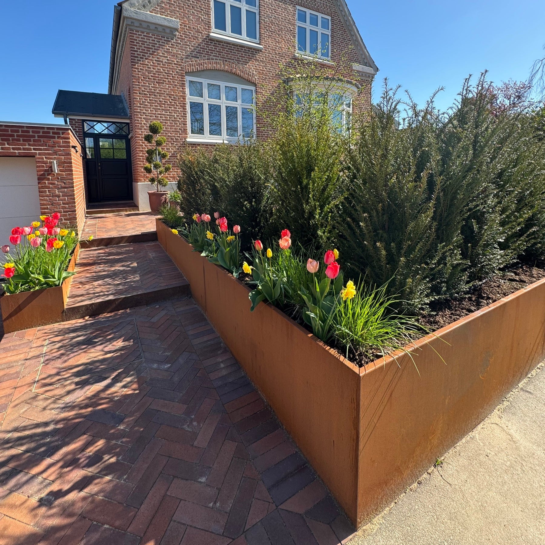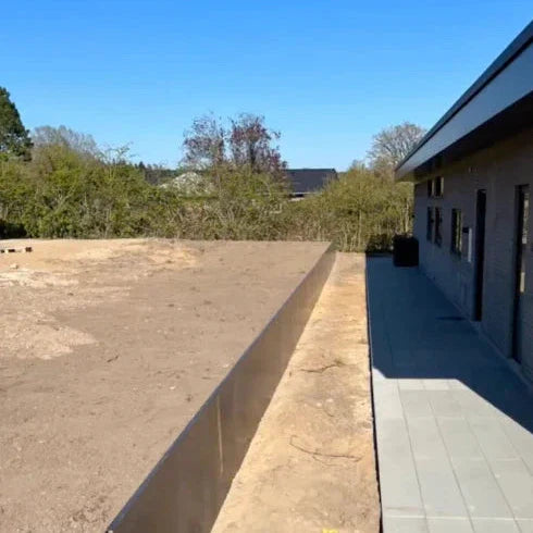 Deze keerwand is gemaakt van 3 mm cortenstaal (dit roest na korte tijd vanzelf door weer en wind). De keerwand heeft een strak ontwerp met een dubbele vouw aan de bovenzijde – voor extra stabiliteit. Een zeer robuuste oplossing voor tuinen, parken en opritten. De keerwand is aan de achterzijde voorzien van verstevigingen om bestand te zijn tegen gronddruk en wordt met de hand gelast in de smederij van Staaltuin in Denemarken.