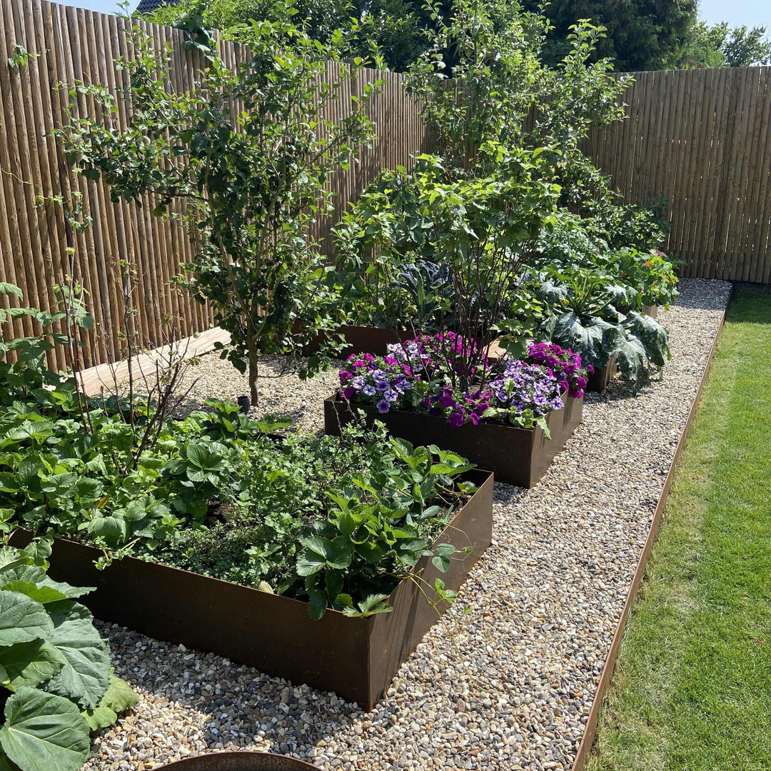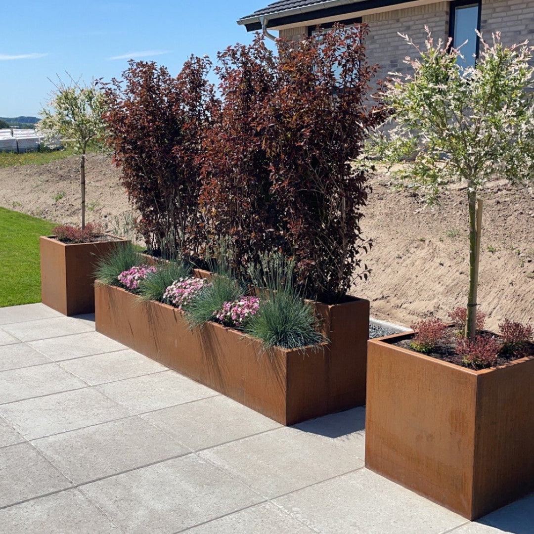 Onze plantenbakken van cortenstaal zijn niet alleen robuust en duurzaam, maar ook uiterst esthetisch. De karakteristieke roestafwerking geeft elke plantenbak een unieke patina, die in de loop van de tijd op natuurlijke wijze verweert en uw tuin een rustieke en moderne uitstraling geeft. Of het nu gaat om het kweken van groenten, kruidenperken of het maken van bloemstukken - onze plantenbakken van cortenstaal zijn veelzijdig inzetbaar en passen harmonieus in elk tuinlandschap.