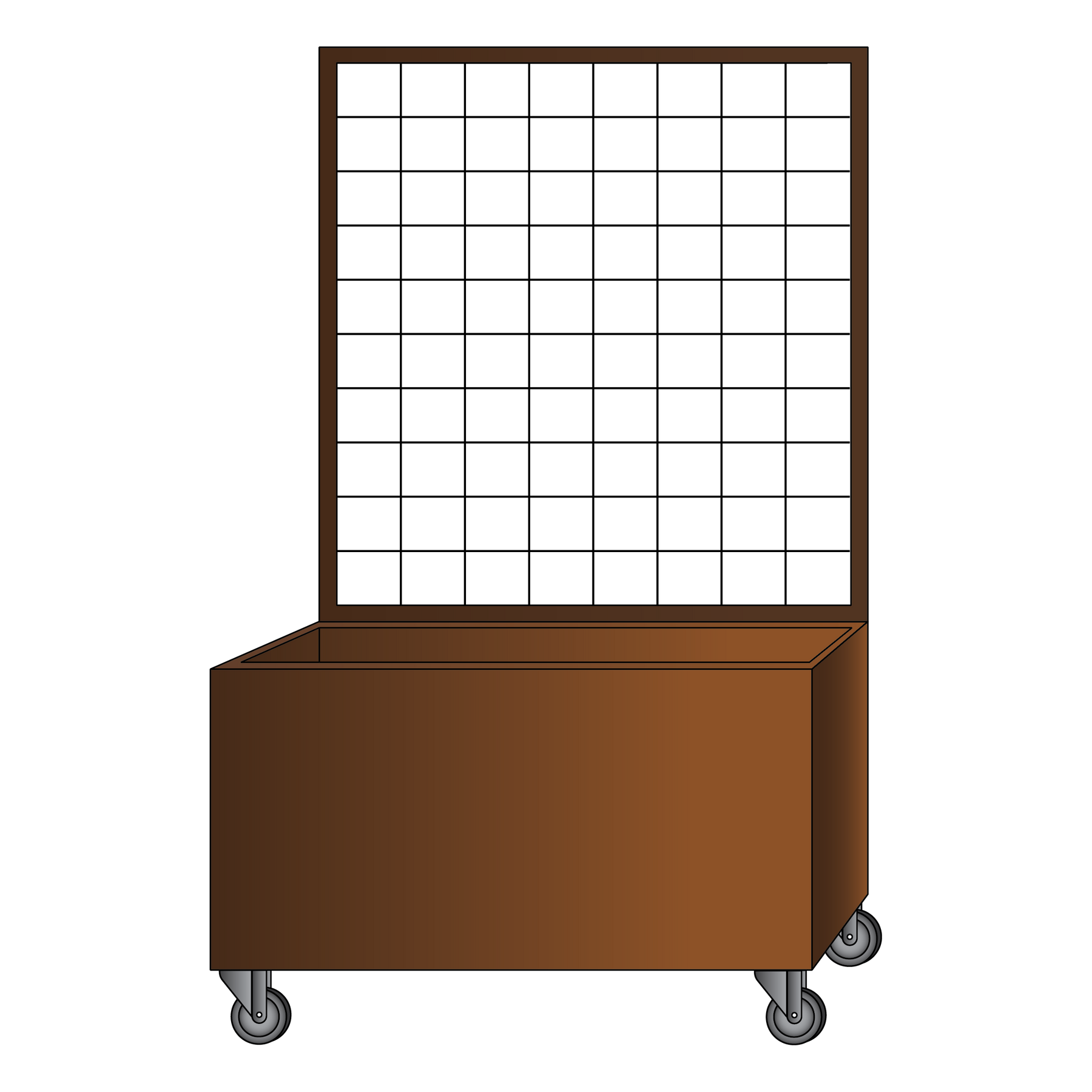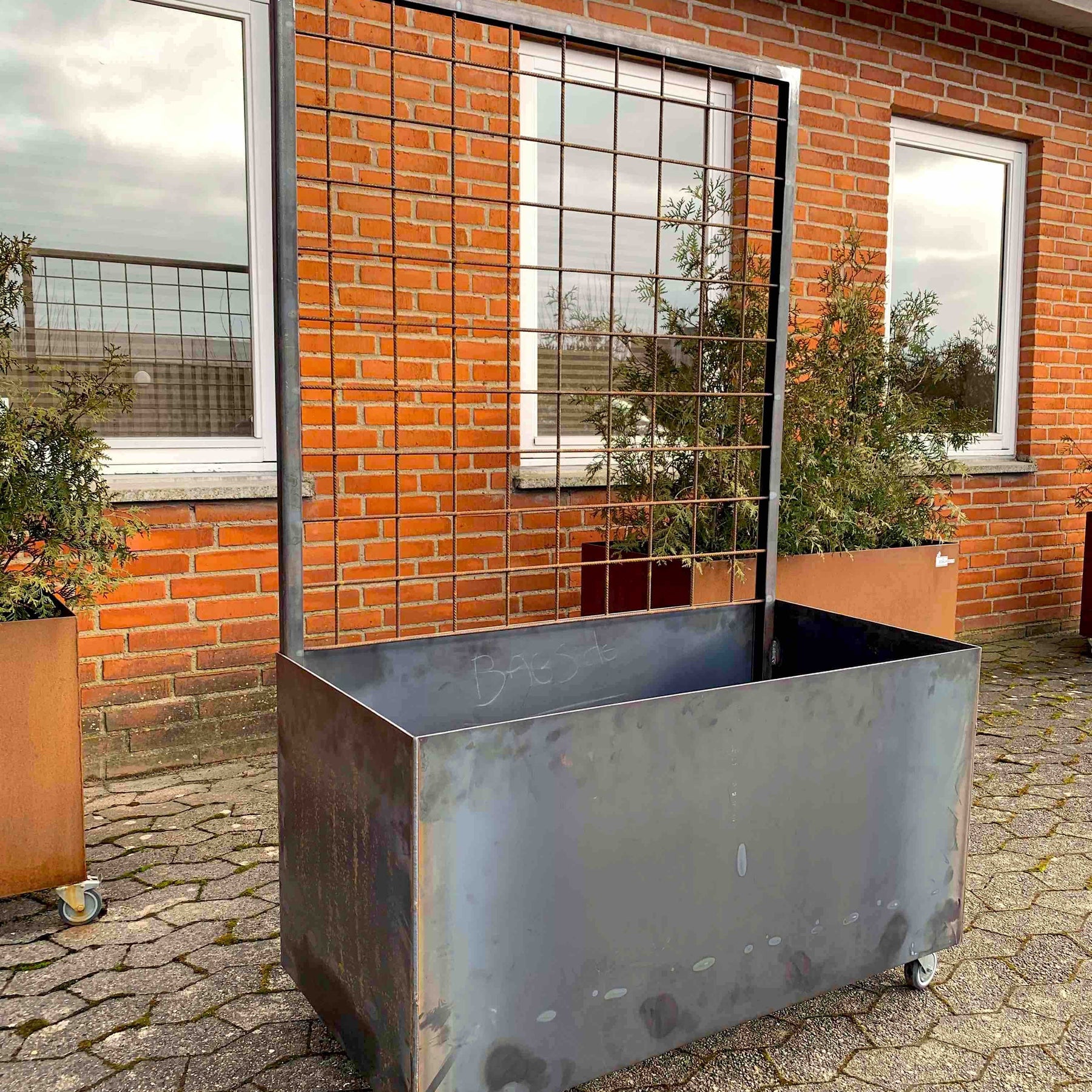 Een plantenbak met trellis van cortenstaal. Ideeal voor het afschermen of opdelen van ruimtes op het terras, bij een café of in de orpit. Het trellis heeft een maaswijdte van 10 x 10 cm, geschikt voor diverse klimplanten zoals klimop, en biedt natuurlijke beschutting. Het trellis is volledig gelast in een frame van U-profiel van 3 mm cortenstaal.