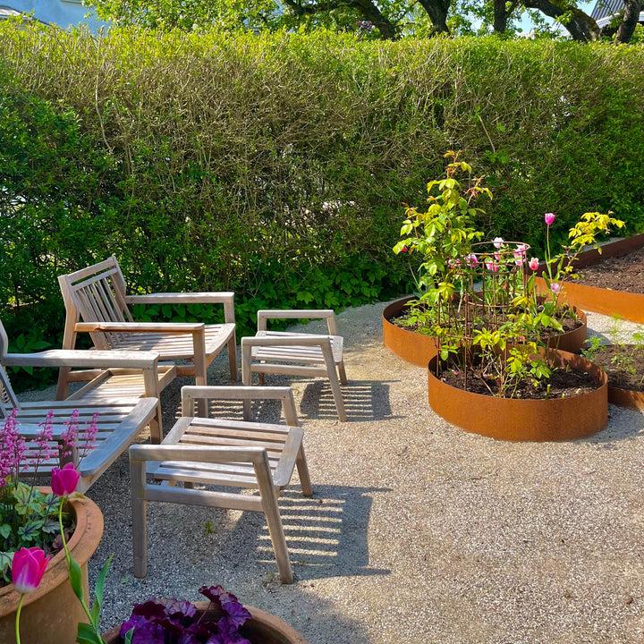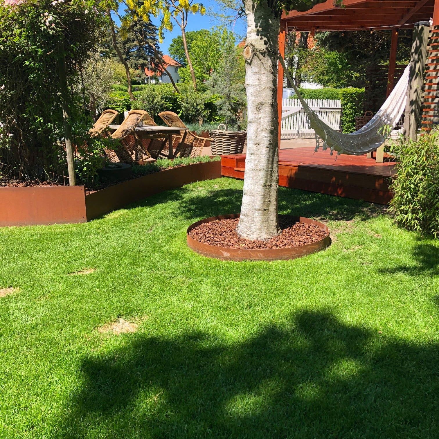 Deze ronde borderrand van 3 mm cortenstaal wordt volledig volgens uw opgave gesmeed en geproduceerd. Zo past ze perfect in uw tuin.