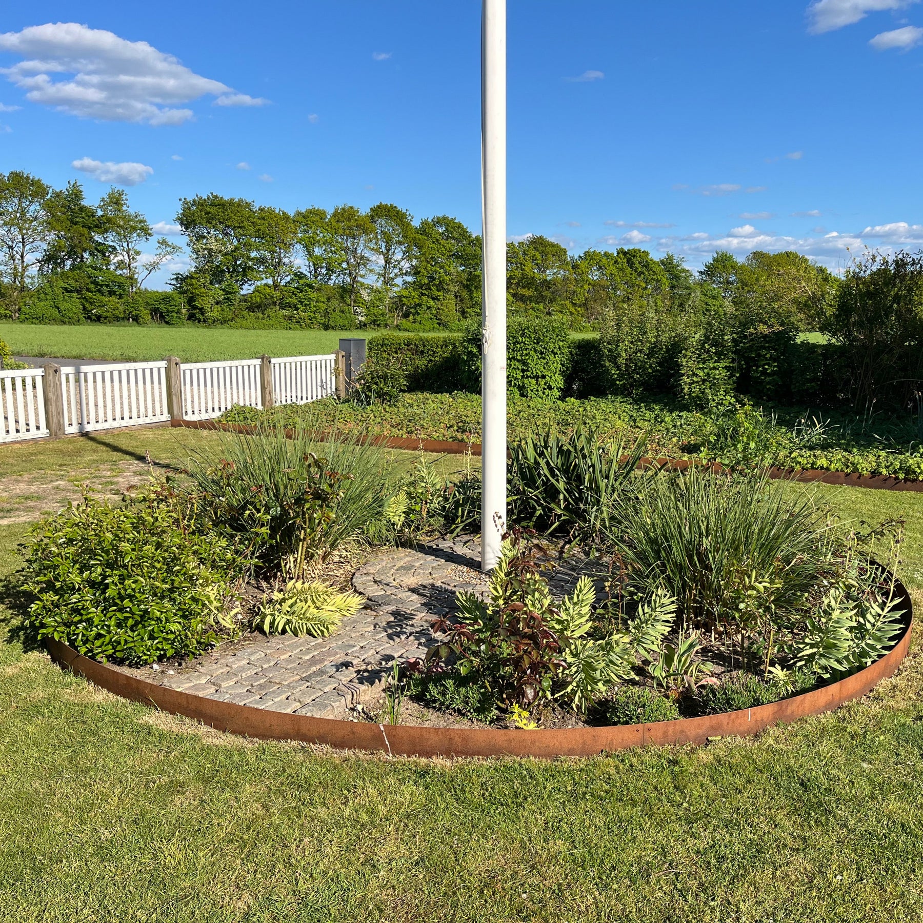 Deze ronde borderrand van 3 mm cortenstaal is perfect voor het afbakenen van een rond bloembed - bijvoorbeeld rond een vlaggenmast of in het midden van een oprit.