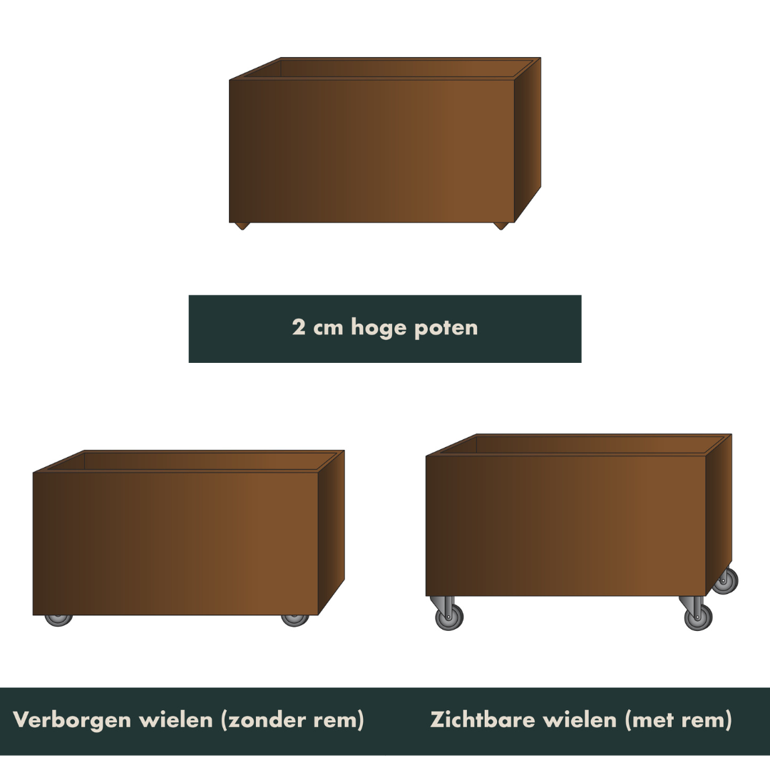 Wanneer je de plantenbak ontvangt, is deze nog niet verroest (zoals op de foto’s). De roestlaag ontstaat vanzelf na enige tijd buiten – er zijn dus geen chemicaliën of andere middelen nodig om de unieke, warme roestkleur te verkrijgen. Wij raden af om dit proces te versnellen met chemicaliën, azijn, zout, zuur of andere middelen.