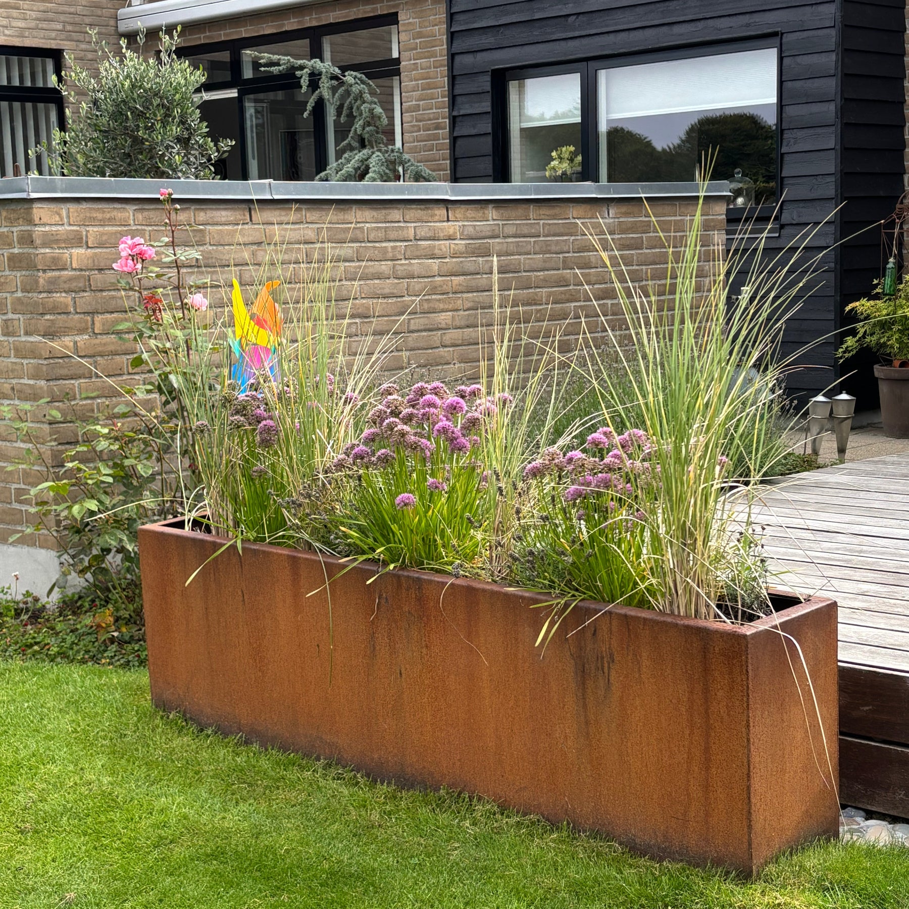 Een rechthoekige plantenbak van cortenstaal. Deze plantenbak is dankij zijn praktische formaat een van onze betsellers. De plantenbak is volledig gelast in elke hoek. Je hoeft je dus geen zorgen te maken over naden of verbindingen - hij is direct klaar om te beplanten zodra je hem ontvangt.