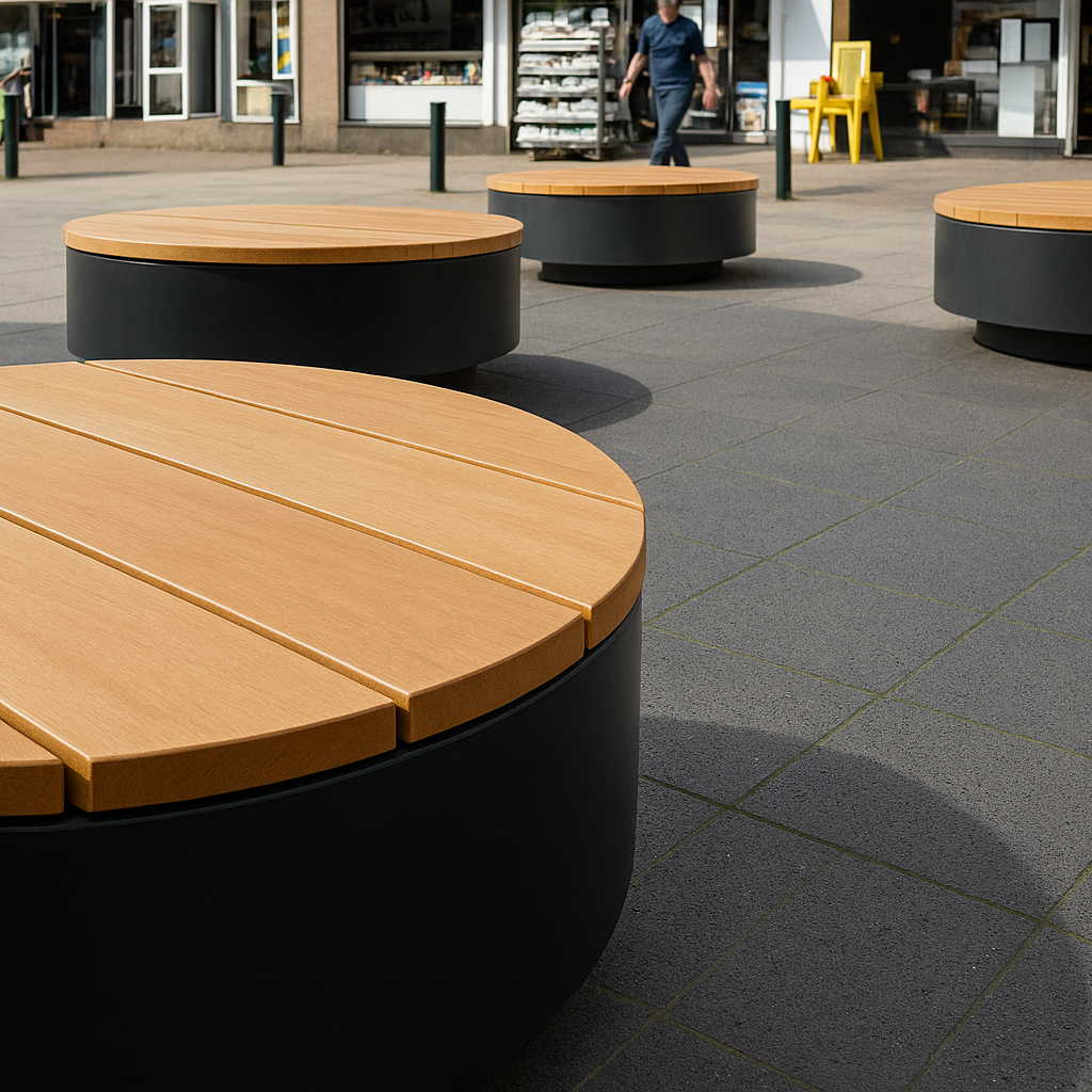 Deze exclusieve, ronde bank is gemaakt van 3 mm dik staal, gepoedercoat in zwartgrijs (RAL7021), en afgewerkt met massief Garapa-hout.