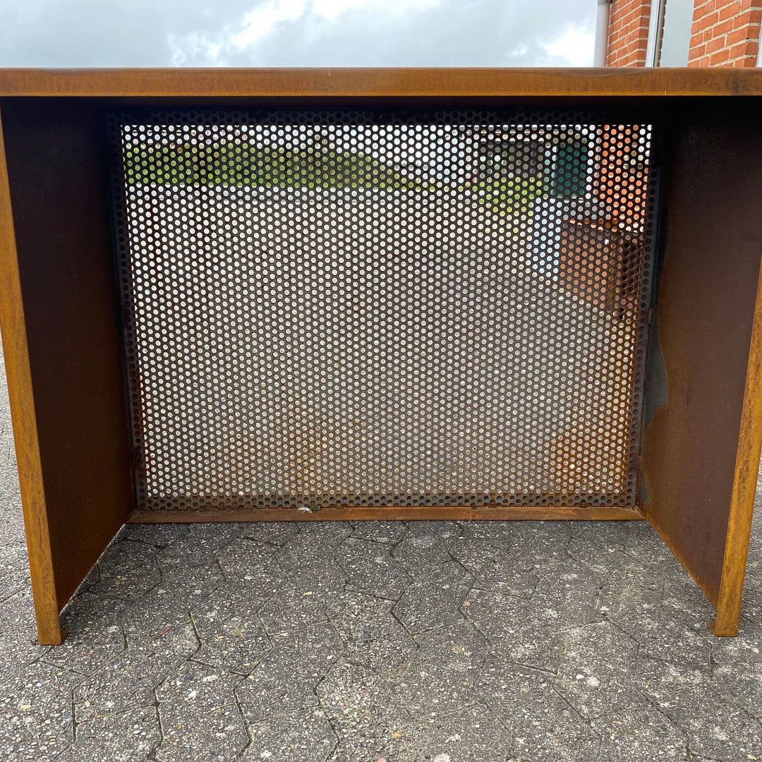 Hier is de overkapping voor uw warmtepomp - vervaardigd uit 3 mm cortenstaal. Volledig gelaste hoeken en naar binnen gezette randen met een geperforeerd frontpaneel zorgen voor een goede luchtcirculatie. De overkapping wordt zonder achterwand geleverd. Dit is een esthetische manier om uw warmtepomp op een nette manier af te schermen.